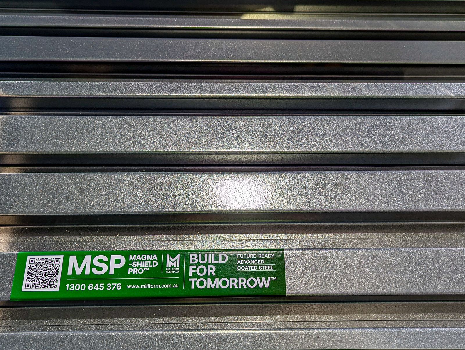 The coating combines zinc with 5% aluminium and 3% magnesium — a formula developed for Millform Australia’s MAGNA-SHIELD PRO™ (MSP). It meets AS 1397:2021 standards with ZM350 designation, which means it provides long-term protection versus traditional galvanised coatings.