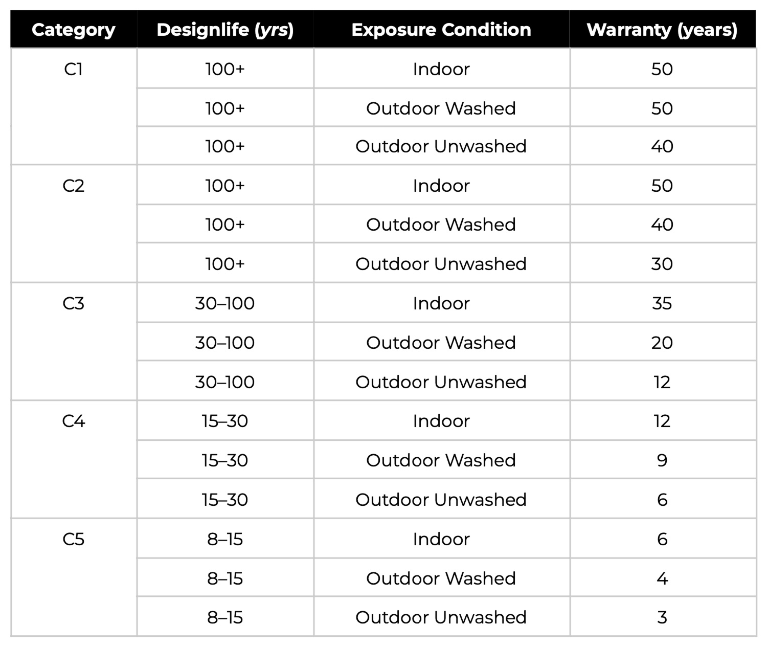 Warranty coverage varies by exposure conditions. Standard terms apply for C1 to C3 environments, while C4 and C5 applications require project-specific coverage. Millform’s technical team can work with you to determine the appropriate warranty periods based on your exact site conditions. If you’d like tailored warranty details for your project, contact our team for a quick assessment.